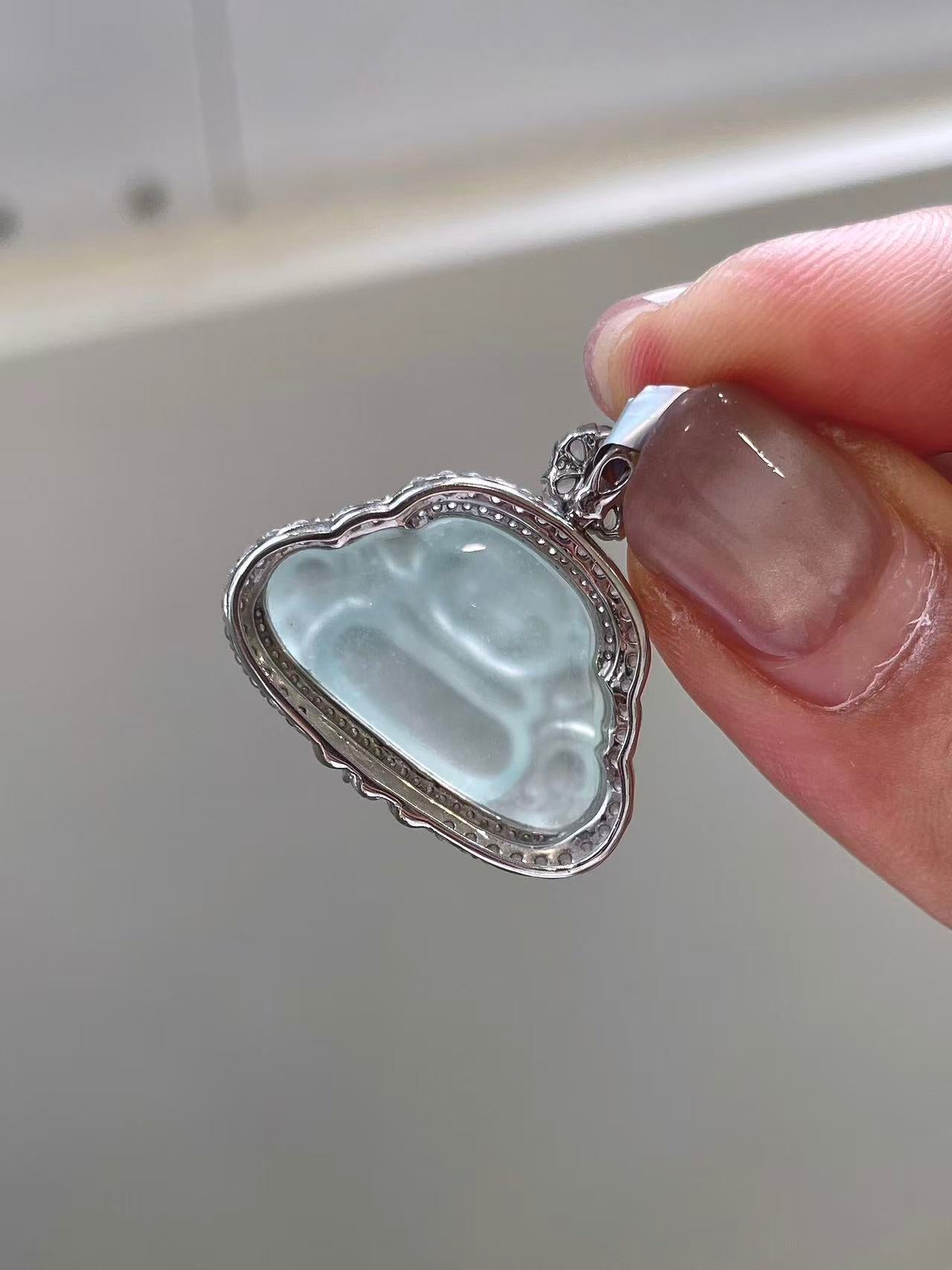 Yuanjiu Jewelry presents this natural high ice Buddha pendant, meticulously carved from crystal-clear high ice jadeite to depict a serene and detailed Buddha figure. Accented with a vibrant green jadeite gem set in 18K gold, the piece radiates a captivating brilliance where gold and jade harmoniously interplay. Blending traditional craftsmanship with modern aesthetics, this pendant carries an aura of elegance and spiritual charm, making it perfect for both daily wear and special occasions. It embodies a beautiful fusion of blessings, peace, and contemporary style.