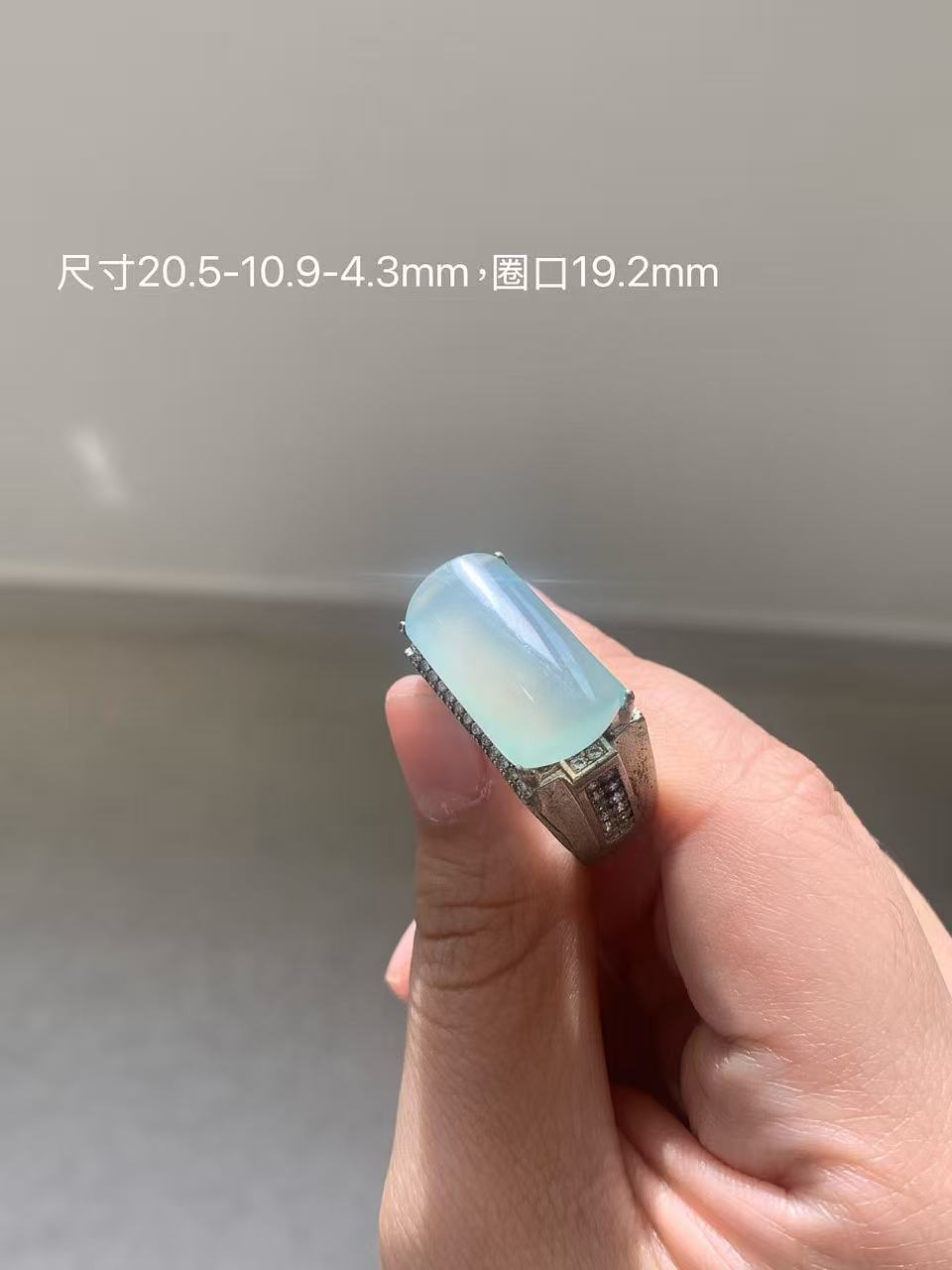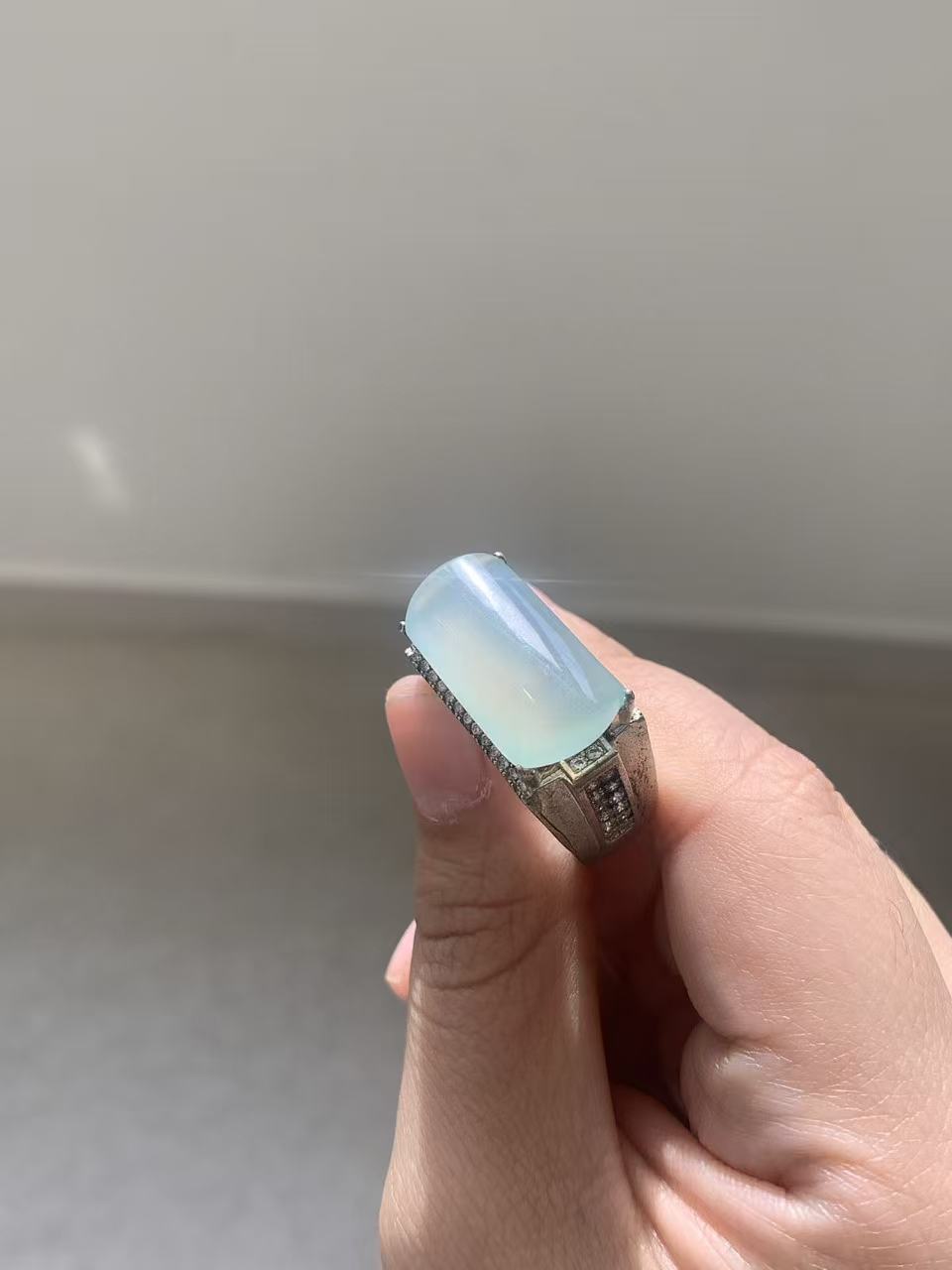 Yuanjiu Jewelry - Natural Translucent 'Qing Di' Jadeite Cabochon Ring, 18K Gold Inlaid, Elegant and Beautiful